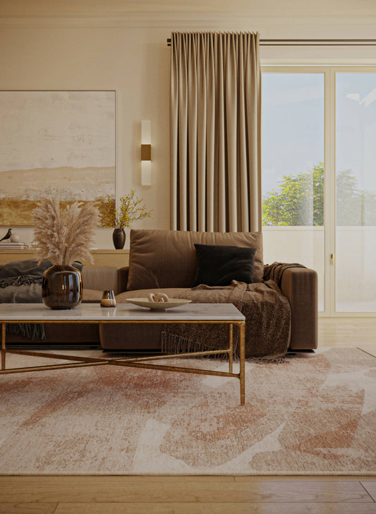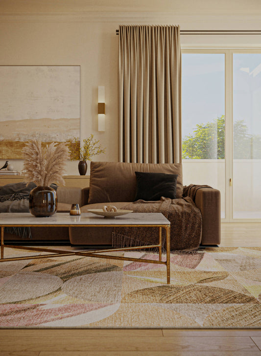 Dive into a world of contemporary design with our printed rug featuring abstract circles and semi-circles in a harmonious blend of pink, beige, and varying shades of brown. This piece effortlessly showcases the beauty of geometric patterns, making it an ideal choice for modern interiors seeking a dash of color and sophistication.