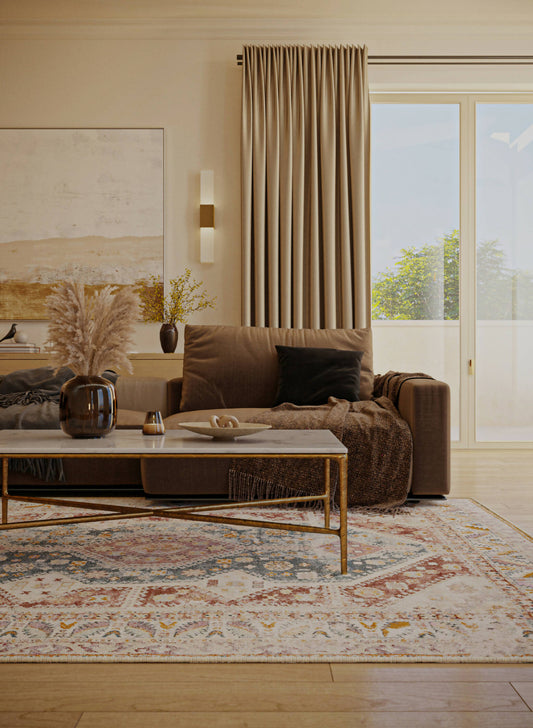 Vintage-style printed rug showcasing oriental designs intertwined with tribal art motifs.