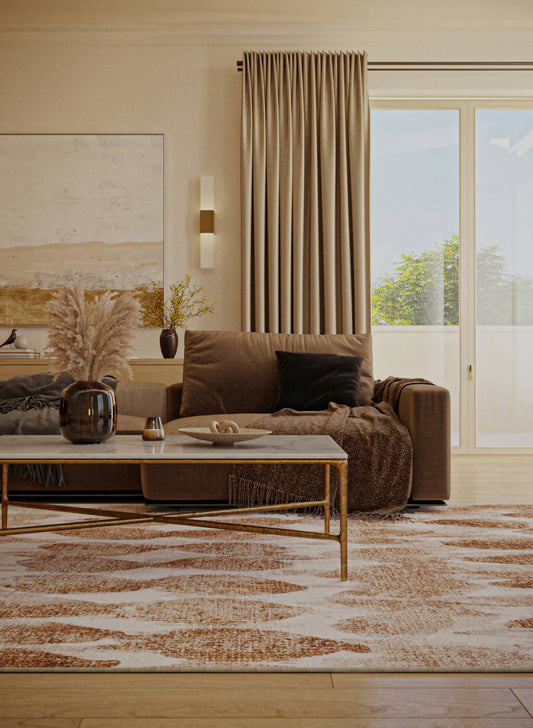 Experience the allure of our uniquely crafted rug, boasting an abstract ornament design in harmonious beige and rust hues. Infused with a watercolor texture, this piece captures the essence of artistry and elegance. A sublime choice for those looking to elevate their interior space with a touch of timeless sophistication.