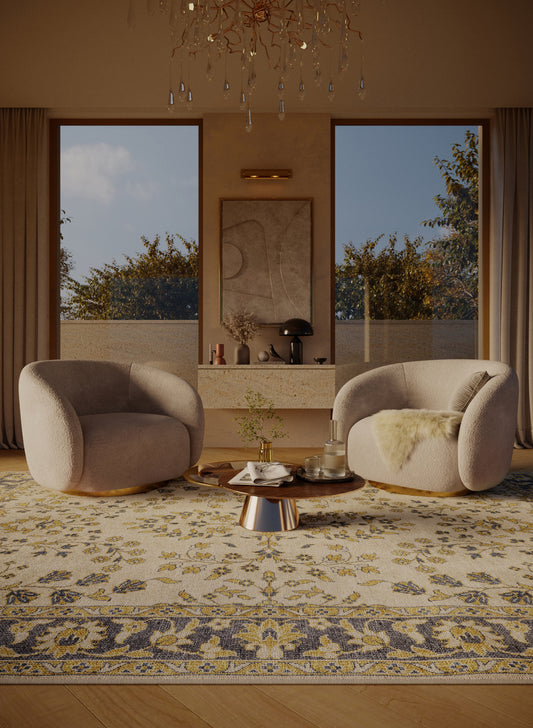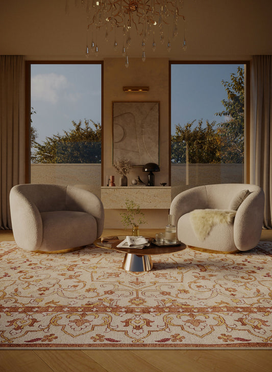 Bright and symmetrical ornamental rug design offers an ideal interior enhancement for contemporary living spaces.