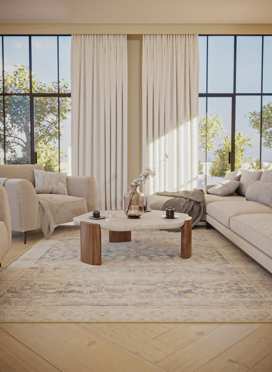 Elegant light-hued rug adorned with floral designs, perfect for enhancing sophisticated interiors.