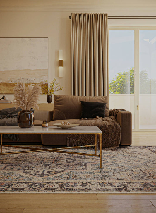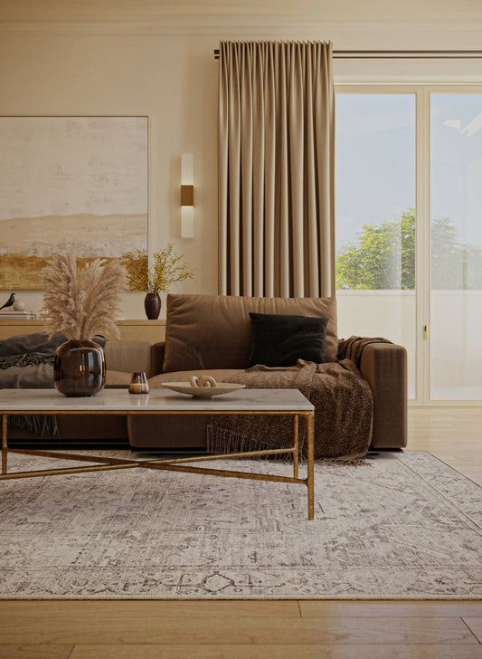 Attic grey rug, influenced by the captivating artistry of the Middle East, offers a blend of mystique and elegance.
