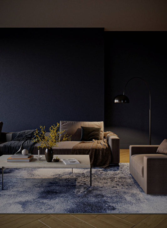 Unveiling a serene piece characterized by a minimalist soft watercolor drawing in mesmerizing shades of deep blue. This printed rug captures the essence of modern tranquility, making it an ideal addition to interiors that appreciate subtle artistry and contemporary elegance.