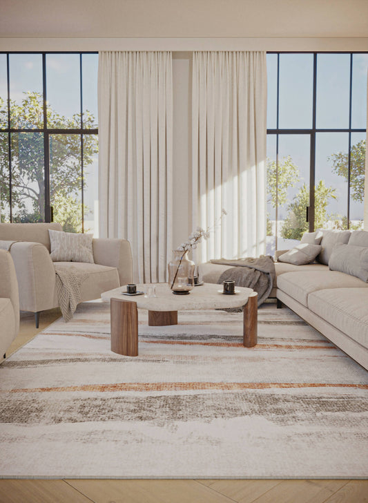 Rust-toned abstract rug with horizontal brush strokes. A unique design blending shades of grey, ideal for modern interiors seeking an original artistic touch.