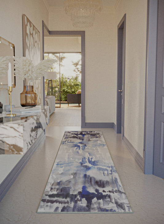 Immerse your space in elegance with our runner rug, featuring a watercolor abstract design. The fluid shapes in soothing cream and grey-blue tones create a serene atmosphere, making it a refined choice for any interior.