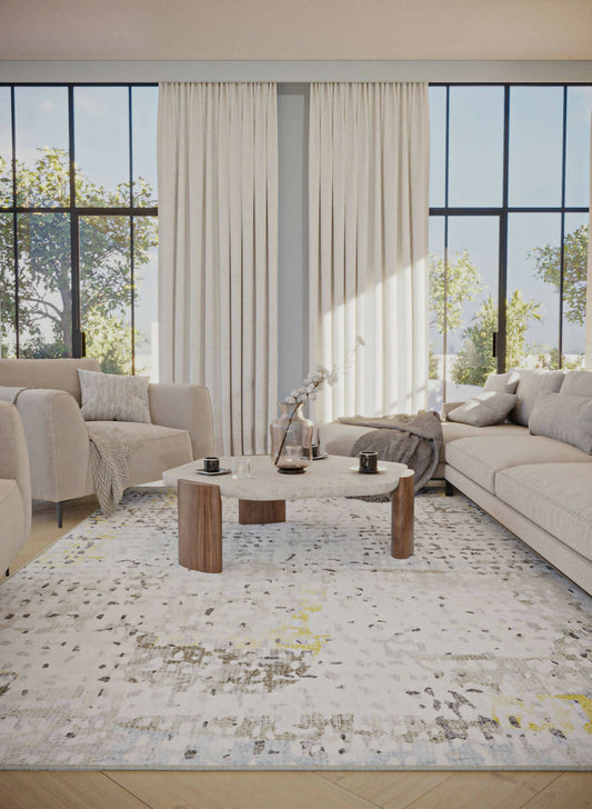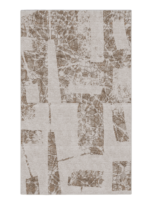 Elegant pastel beige printed rug with a net-textured design, complemented by modern geometric shapes. Ideal for sophisticated interiors seeking a subtle yet contemporary touch.